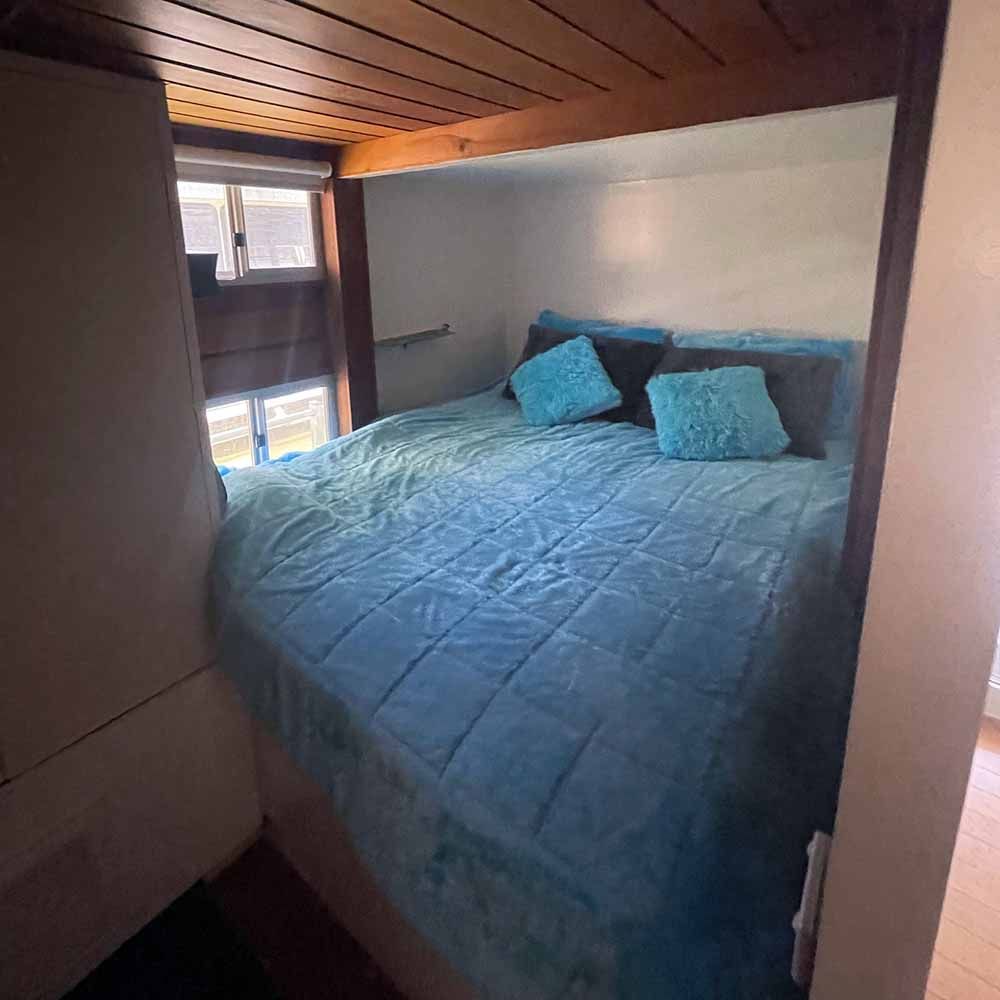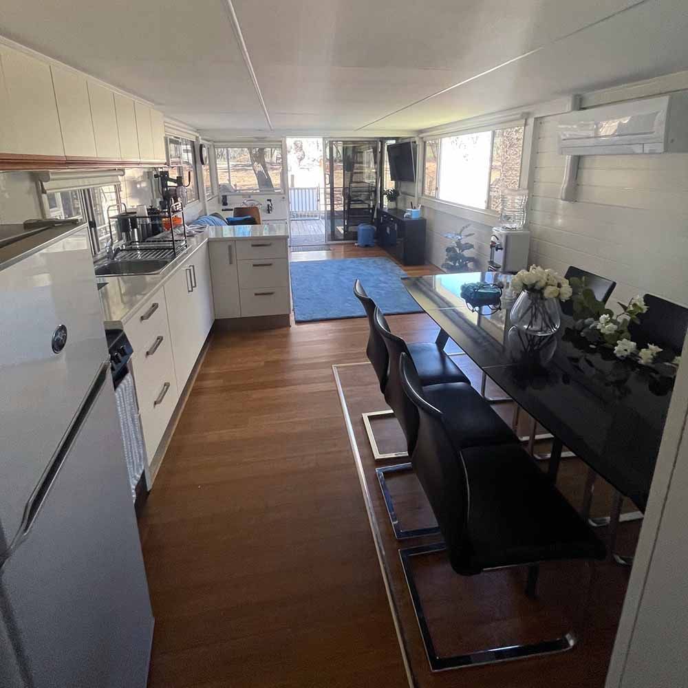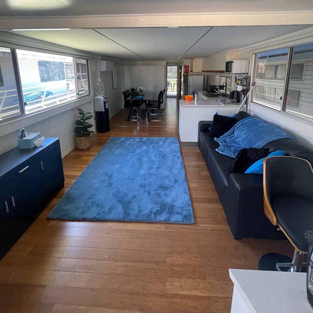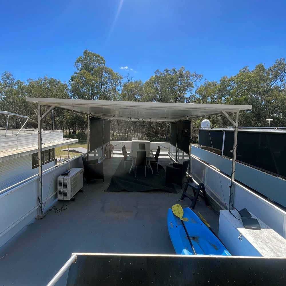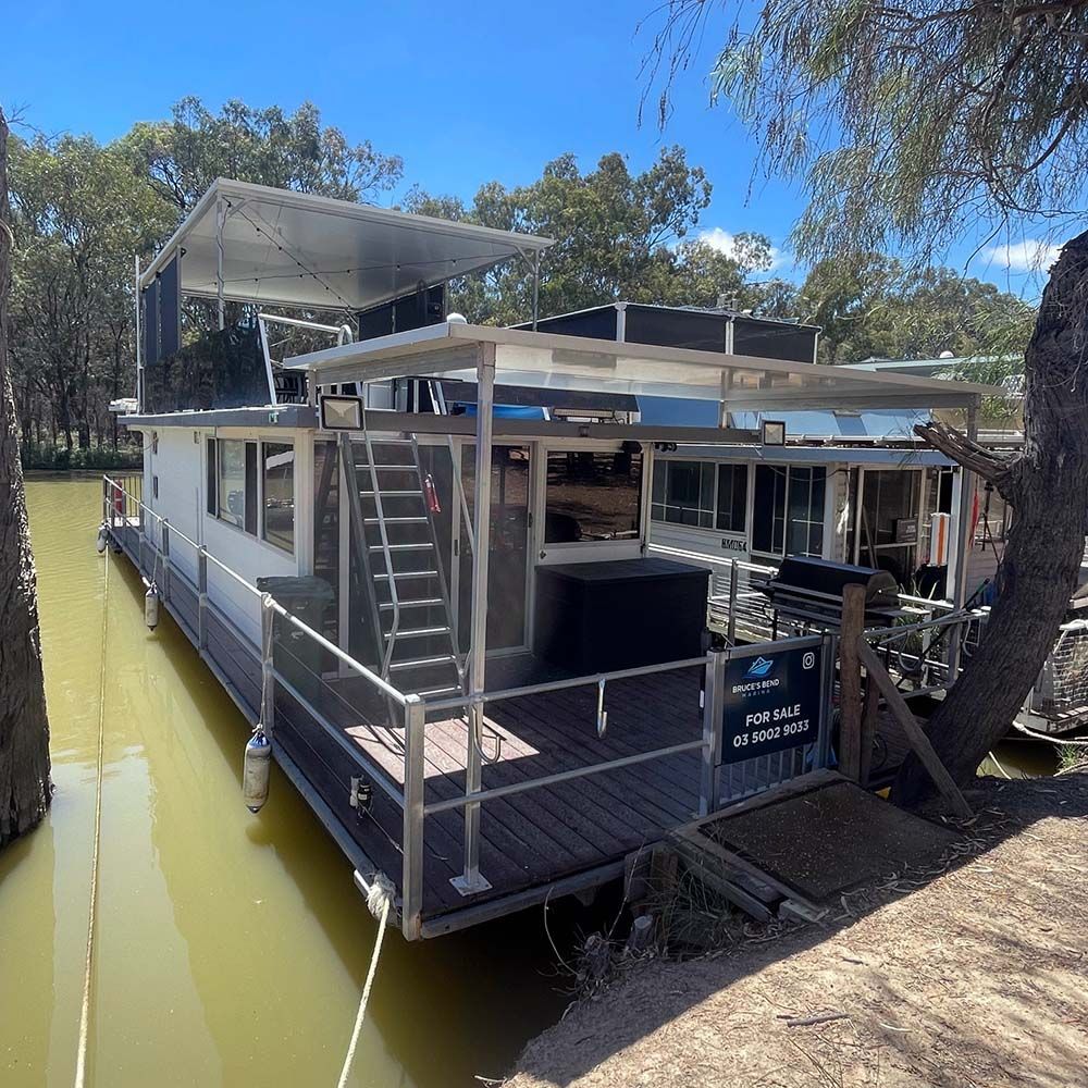 Open plan, neat, well kept house boat for sale with covered rooftop entertainment area. Moored at the Bruces Bend Marina with rental available to the purchaser at $100 per week.